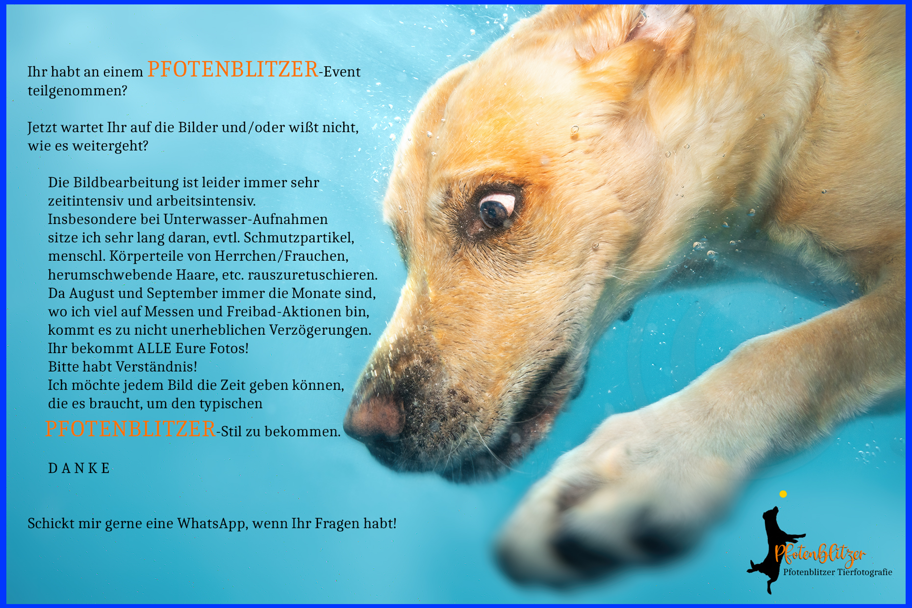 Heute möchte ich Euch einmal das "Tauchen im Studio" etwas näher bringen, weil mich viele Anfragen erreichen, die meißtens mit der Feststellung anfangen, daß der eigene Hund eigentlich gar nicht taucht und dann kommt die Frage, ob man trotzdem solche Fotos machen kann.