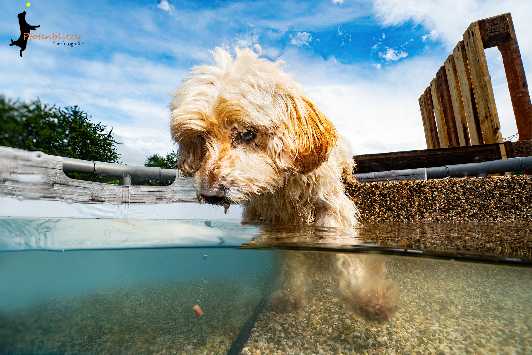Toscha (hier oben im Bild) fand das Wasser im Prinzip ... ja, was soll ich sagen ... überhaupt nicht einladend. Aber mal drin stehen und dem Leckerchen hinterher gucken für die Kamera, ja...das ging. Die Hinterbeinchen mußten aber noch trockenen Kontakt zur oberen Stufe haben - das war Voraussetzung!