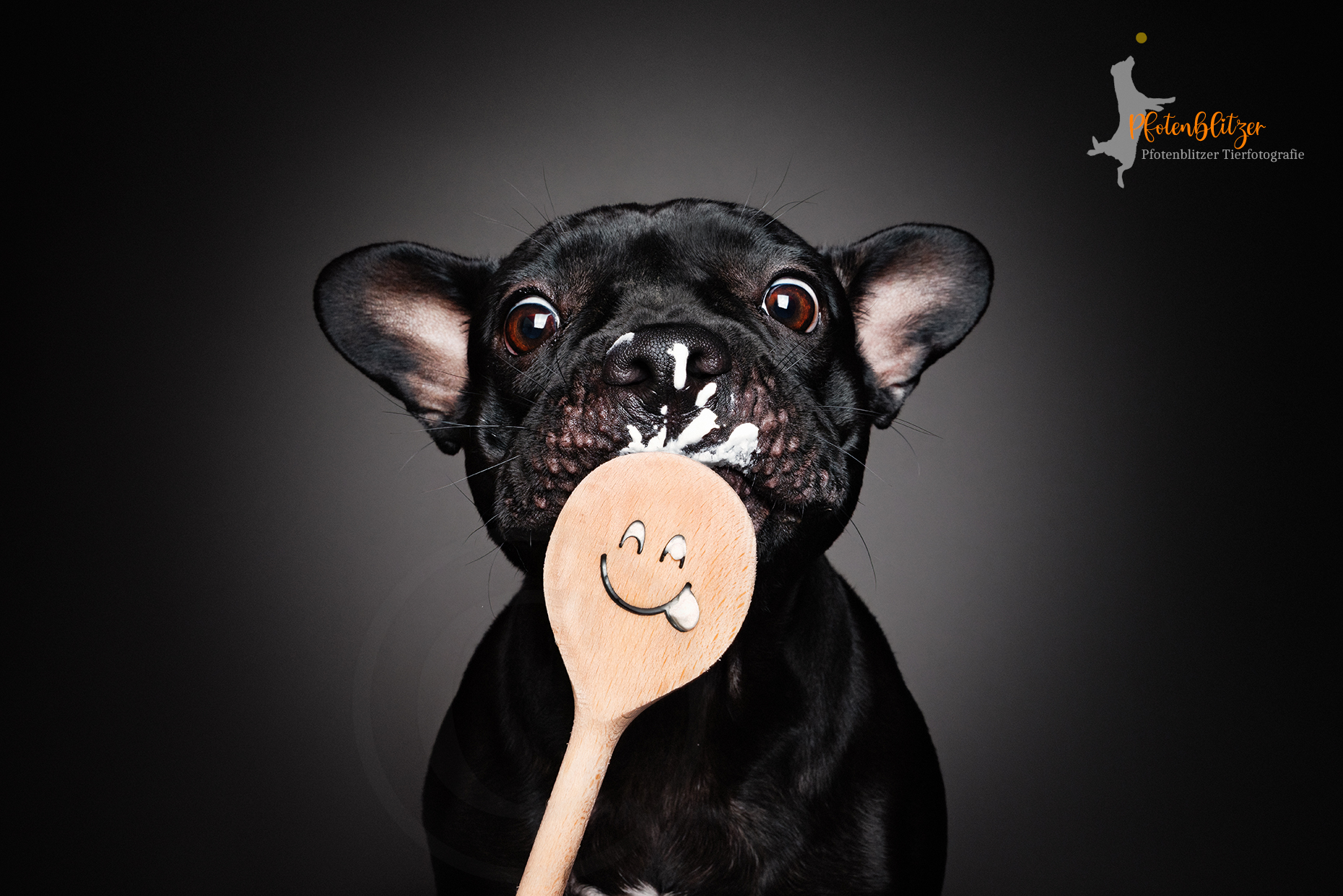 Dein Hund leckt Lachscreme/Leberwurst/Käsecreme/o.ä. von einem Lolli (kein Zuckerersatz-Stoff, sondern ECHTER Zucker) und laktosefreie Sahne (zuckerhaltig) von einem lustigen Holzlöffel. Danach "fliegen" Käsewürfel in seine Richtung (oder halt Leckerchen, die Dein Hund verträgt), um lustige Fangversuch-Bilder zu bekommen.Sollte Dein Hund Unverträglichkeiten haben, kannst Du selbstverständlich auch eigene Sachen mitbringen, die Dein Hund dann fängt oder von Lolli/Holzlöffel lecken kann. Das ist kein Problem :-)